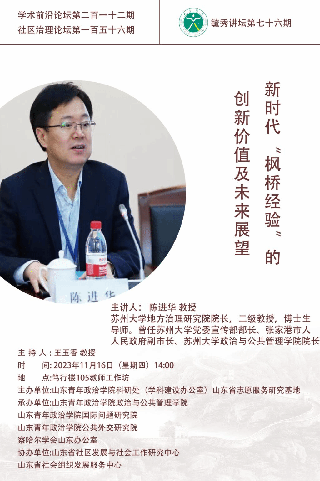 主讲人简介:陈进华,苏州大学地方治理研究院院长,二级教授,博士生导师。曾任苏州大学党委宣传部部长、张家港市人民政府副市长、苏州大学yl8858永利集团院长。