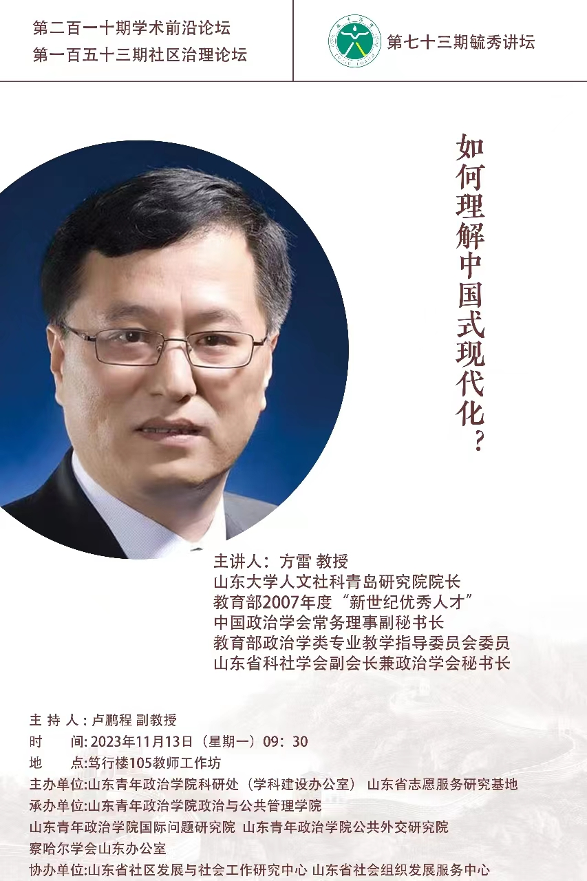 主讲人简介:方雷,法学博士,教授、博士生导师,现任山东大学人文社科青岛研究院院长,互联网+党建研究中心主任,教育部2007年度“新世纪优秀人才”。兼任中国政治学会常务理事副秘书长,教育部政治学类专业教学指导委员会委员,中国城市经济学会常务理事,山东省科社学会副会长兼政治学会秘书长,山东省领导科学学会副会长,山东省工人运动研究会副会长。主持国家社科基金项目3项,教育部社科规划项目1项,山东省社科规划重大项目1项目。多次参与国家和教育部重大攻关项目和重点项目的科研活动。发表科研论文70余篇,撰写著作有《政治断层带的嬗变》、《地方政府行政能力研究》、《政治科学研究方法概论》、《地方政府学概论》等6部,参著和参编10余部。获省部级科研成果奖励8项,省社科优秀成果二等奖一项,三等奖一项。