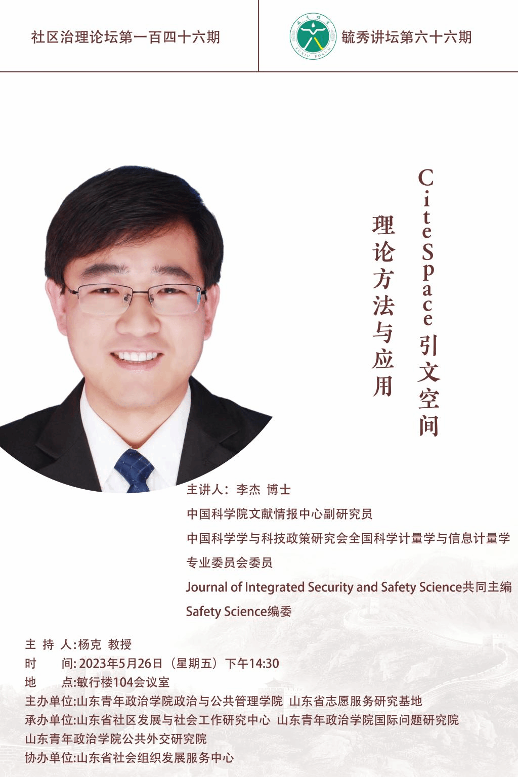 主讲人简介:李杰,博士、博士后。现为中国科学院文献情报中心副研究员。主要从事科学计量学、安全科学以及科学知识图谱的研究。目前担任中国科学学与科技政策研究会全国科学计量学与信息计量学专业委员会委员、Journal of Integrated Security and Safety Science共同主编、Safety Science编委(IF=6.392)、《安全与环境学报》青年编委会副主任以及《中国安全科学学报》、《风险灾害危机研究》、《西安科技大学学报》等学术期刊编委或青年编委,发表学术论文80余篇(ESI高被引论文3篇,热点论文1篇)、出版论著、译著、研究报告10余部,作为 “科学计量与知识图谱丛书”主编出版了《CiteSpace科技文本挖掘及可视化》(总被引3000余次)、《科学知识图谱原理及应用》、《科学计量与知识网络分析》以及《R科学计量数据可视化》等5部著作;在安全科学领域出版了《安全科学知识图谱导论》以及《安全科学学术地图》系列丛书(包括综合卷、火灾卷、热爆炸卷)。主持国家自然科学基金青年基金项目1项,主持科技部科技评估中心、应急管理部宣教中心等单位横向课题5项。