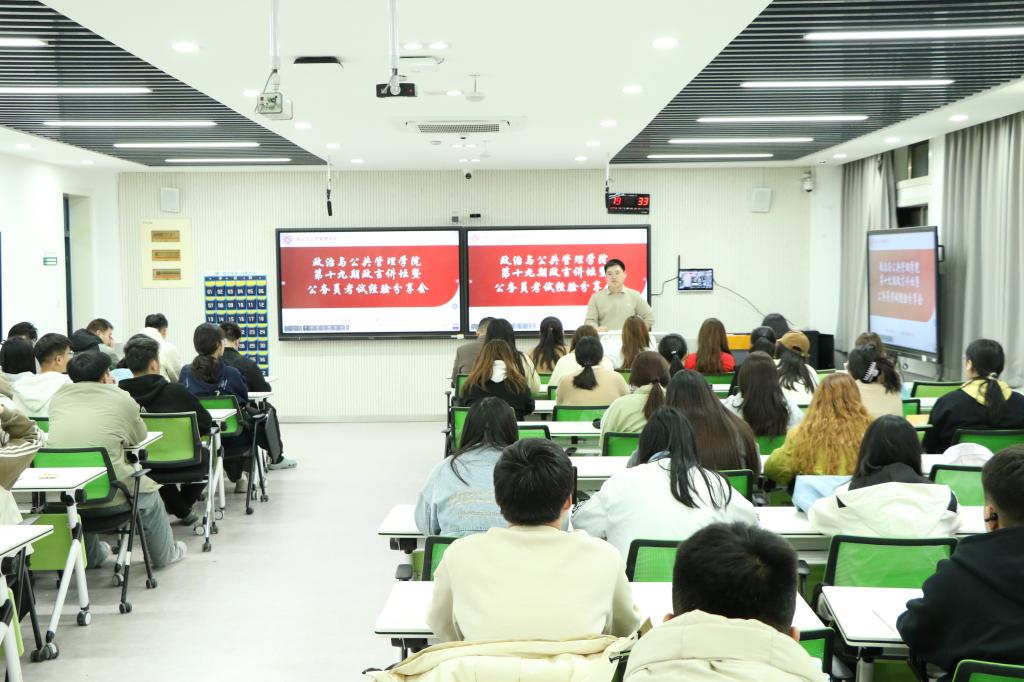为充分发挥优秀学子的榜样示范作用,帮助学生增加对公务员考试的了解,进一步明确自身职业规划,3月15日,yl8858永利集团于知行楼514室开展第十九期政言讲坛暨公务员考试经验分享会,邀请2020级公共事业管理一班班长李星灿为大家传授考公经验。分享会由辅导员李新华主持。