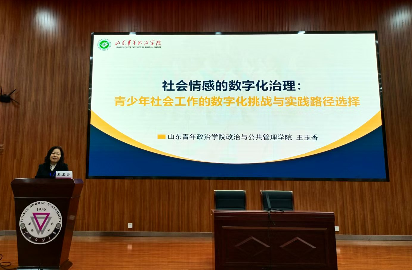 王玉香作为中国社会工作教育协会学校与青少年社会工作专业委员会副主任应邀为此次论坛开幕式致辞,对来自全国各地的学者表示热烈欢迎,对云南师范大学社会工作专业的发展给予高度评价。随后在大会作了主题为“社会情感的数字化治理:青少年社会工作的数字化挑战与实践路径选择”的主旨演讲,内容涉及数字化时代青少年群体特征以及当下青少年社会工作面临的困境,提出需着力提升青少年的社会情感能力。该报告是王玉香聚焦青少年时代特点、回应当下青少年社会问题的全新研究成果,为青少年心理健康发展与青少年社会工作转型提供了全新的理论视角,引起了与会者的广泛关注和积极讨论。会后王玉香接受了云南电视台的采访。