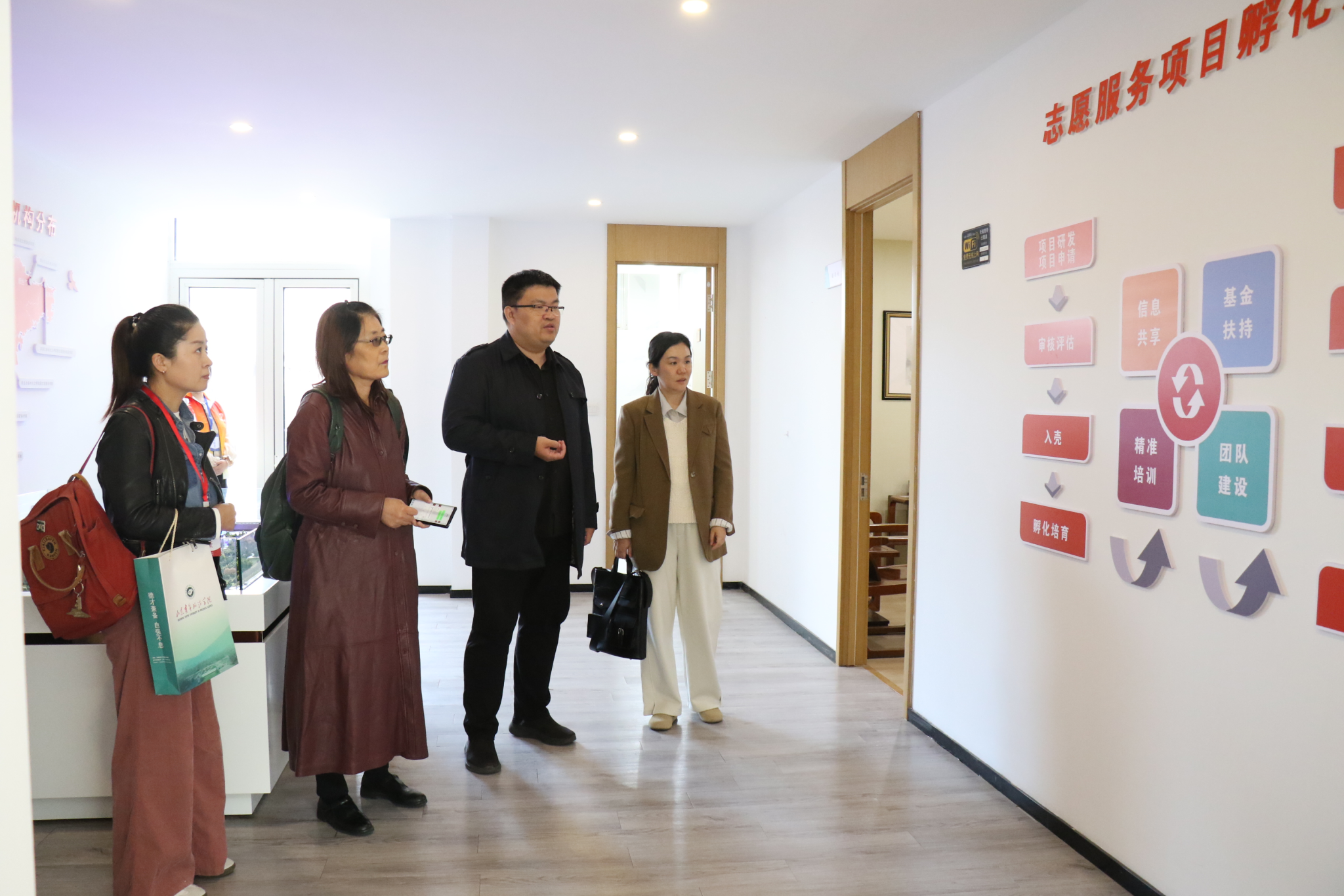 在参观过程中,王正坤向来访专家详细介绍了志愿服务项目孵化基地(山东)、中国志愿服务研究中心山东分中心、山东省志愿服务研究基地、山东省新时代文明实践志愿服务研究培训中心、山东省新时代志愿服务管理学院在志愿服务项目、运营模式以及未来发展规划等方面的具体情况。他们对基地在志愿服务方面的积极探索和取得的成效给予了高度评价,认为我校的志愿服务工作不仅有助于培养学生的社会责任感和实践能力,还能够为社会提供有力的支持。