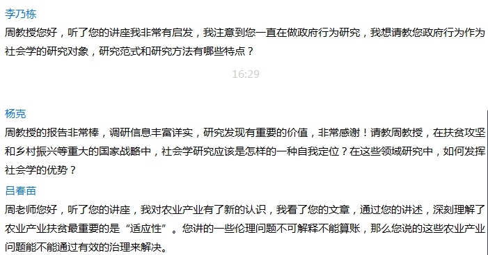 王玉香院长总结强调,周教授的报告指出乡村振兴的核心是劳动力,也就是“人”的问题,所以农村产业发展主要依靠乡村伦理和乡村共同体的建设。正如英格尔斯在《人的现代化》中所说,先进的现代制度若想获得成功,取得预期效果,必须依赖人的现代人格和品质,从心理、态度、行为上与各种现代形式的经济发展相适应,才能真正实现现代化。对乡村振兴来讲,只有将乡村产业振兴和乡村伦理秩序有机结合起来,才能够真正实现乡村振兴。周教授关于农村产业发展的调研非常细致和充分,让我们体会到田野调查和实证研究的魅力,将现实的经验和社会学理论、政策有机结合在一起,揭示现实中的问题和症结,从而提出好的解决办法和建议,推动经济社会发展。王院长要求师生们认真学习周教授扎根乡村调查研究的精神,积极投身社会实践和社会研究,不断开阔视野,增强问题意识,结合实际提升分析和解决社会问题的能力。
