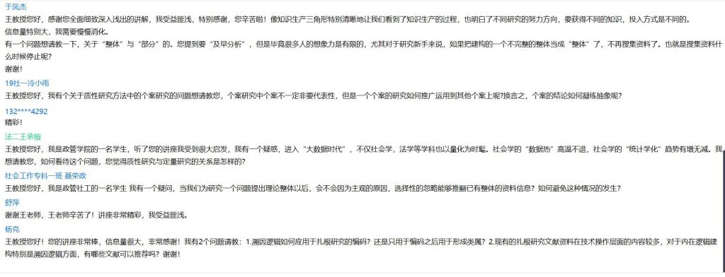 宋全成教授在点评中表示王宁教授对知识生产和质性研究的讲解极富逻辑性,见解很有启发意义,体现在以下几个方面:强调的知识贡献的本质在于创新,一方面需要解决外部问题的社会科学投入,另一方面也要有侧重理论的内部驱动;指出理论研究既有替代性的、也有扩展性的,其过程或是添加式的,或是整合式的,但都需要注意实用性。宋教授认为质性研究中的访谈和扎根两大理论称得上是社科研究的点金术,尤其是扎根理论中的编码分析模式,启发我们从有限部分中及早发现整体,值得学习领会。