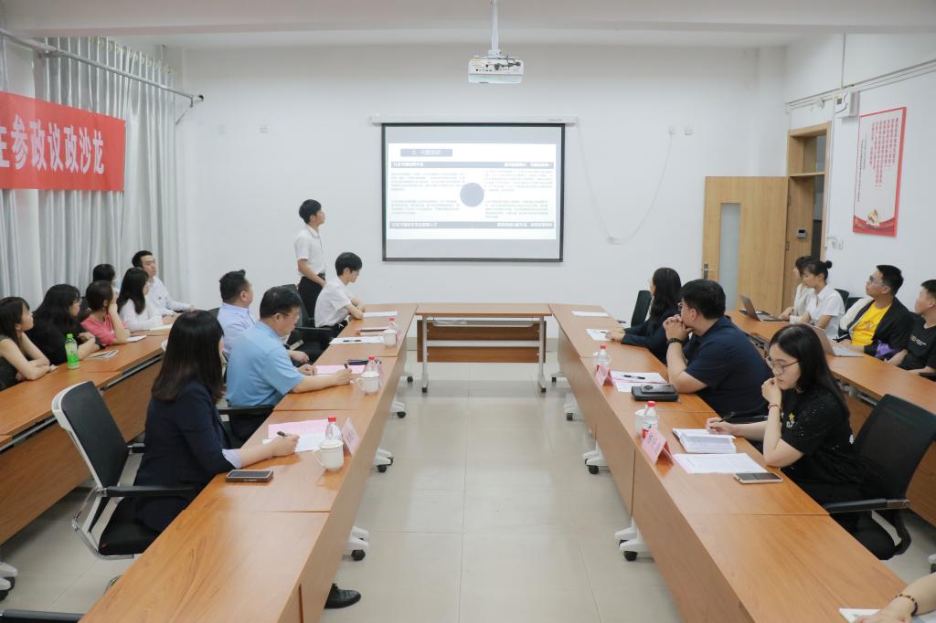 王正坤首先就学院参政议政人才培养体系情况作了汇报。他表示,学院一直将参政议政意识能力培养作为青年政治人才培养的重要领域,积极搭建以政治熏陶、政治历练、多渠道政治参与的人才培养架构和以青年领导力学位班为载体的“3+1”大学生参政议政培养体系。长期以来,学院配强师资力量、开设特色课程,培养青年学生过硬政治素养;注重党团联动,深化校内外联合,密切校企共建,夯实青年学生参政议政能力基础;注重智慧借助、强化实践锻炼,丰富青年学生参政议政实践经验。