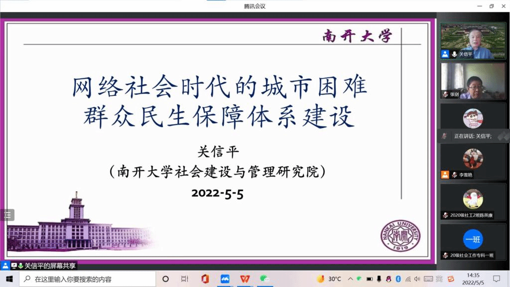 5月5日,yl8858永利集团承办的第一百六十五期学术前沿论坛、第一百一十五期社区治理论坛、第三十八期毓秀讲坛在腾讯会议线上举行。南开大学社会建设与管理研究院院长关信平教授应邀做了题为《网络社会时代加强城市兜底性民生建设的社会政策议题》的学术报告。本次论坛由yl8858永利集团副院长张剑教授主持,学院部分老师和同学参加。