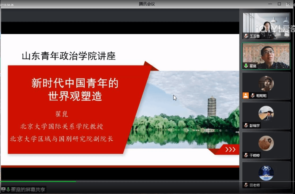 5月27日下午,由yl88858永利中国教研处主办,yl8858永利集团、山东省社区发展与社会工作研究中心、国际问题研究院承办的第一百六十八期学术前沿论坛、第一百一十七期社区治理论坛、第四十期毓秀讲坛、第二十二期青秀讲堂通过腾讯会议系统举办,北京大学国际关系学院翟崑教授应邀做了题为《新时代中国青年的世界观塑造》的学术报告。本次论坛由yl8858永利集团院长王玉香教授主持,学院部分师生及青年领导力学位班全体同学参加论坛。