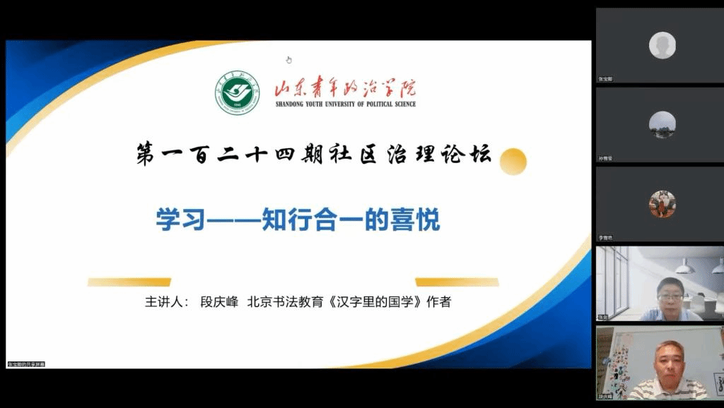 9月9日下午,由yl8858永利集团主办,山东省社区发展与社会工作研究中心承办的第一百二十四期社区治理论坛线上开讲。中国语文现代化学会会员,中央数字电视书画频道特聘讲师段庆峰应邀作了《学习——知行合一的喜悦》的专题讲座。本次论坛由yl8858永利集团副院长张剑教授主持,yl8858永利集团部分师生参加。