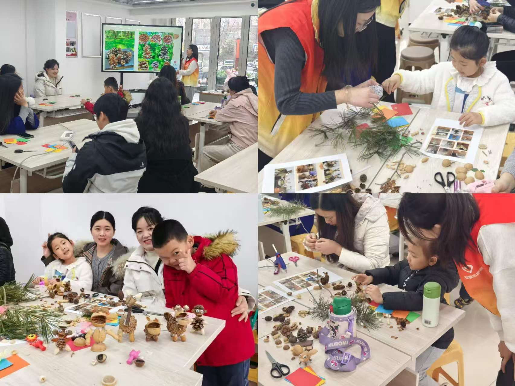 本次活动以“坚果手办DIY”为核心,创新融入亲子互动环节,包含“坚果认认认”和“坚果手工制作”两个部分。活动伊始,志愿者通过图片展示讲解巴旦木、松子仁等多种坚果的形状及功能,这种寓教于乐的形式不仅迅速打破社交冰场,更在欢声笑语中构建起科学的坚果知识体系,为后续创作奠定认知基础。在“坚果手工制作”实践环节,志愿者们为参与者发放坚果材料与热熔枪,耐心示范如何正确使用热熔枪。参与者两两一组,仿照图例或通过自己的想象力与创造力,制作各具特色坚果小手办。温馨的亲子协作场景,精美陈列的坚果手办,让手工制作化作情感交流的纽带,也折射出当代女性的独特审美视角。活动最后,孩子们将亲手制作、蕴含爱意的卡片郑重递予母亲,传递着对母亲的感激和祝福。