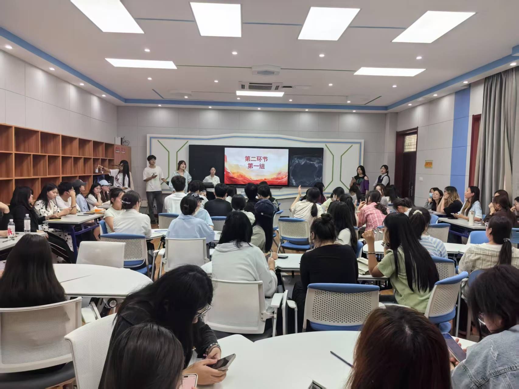 本次活动选取《中国共产党的一百年》作为阅读书籍,以知识竞赛形式强化学生对党史的认识与了解,吸引了17支队伍、70余名学子参与。竞赛共分为“博闻强识”“争分夺秒”“绝地求生”“巅峰对决”四个环节。第一环节“博闻强识”为试卷作答,参赛选手以小组为单位在规定时间内答卷,充分展示了扎实的党史知识储备。第二环节“争分夺秒”为1分钟限时作答,各参赛队伍成员相互配合、集思广益,快速作答,现场气氛热烈。