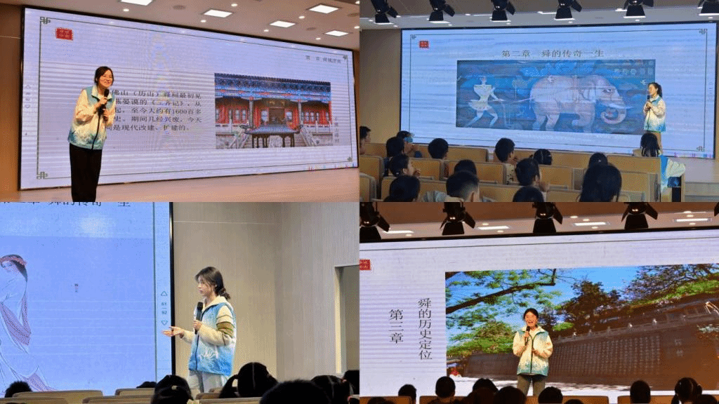本次宣讲活动主要分为三个部分:“舜城济南”“舜的传奇一生”“舜的历史定位”。活动伊始,宣讲团成员从“济南应该是‘泉城’还是‘舜城’”这一话题切入,带领孩子们共同找寻藏在千佛山、趵突泉、大明湖等景点中的舜文化。随后,成员们通过讲述大舜的生平事迹,引导孩子们了解孝顺、友爱、诚信等中华优秀传统美德,以传统美德浸润孩子们的心灵。同时为帮助孩子们更好理解宣讲内容,宣讲团成员还设计了多个互动环节,让孩子们在互动中感受大舜文化的魅力,孩子们积极举手发言,争相分享自己对大舜文化的理解和感悟,现场氛围活跃。