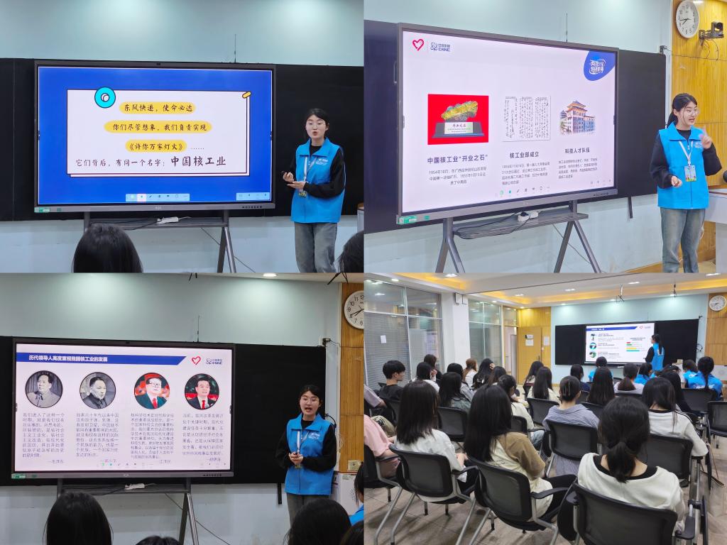 活动过程中,宣讲团成员以视频展示、情景再现、现场讲解等方式,真情讲述金银滩草原1279户牧民听从党的号召、服从国家需要,远迁他乡支援基地建设的真实故事;讲述我国“两弹一星”事业发展的辉煌历程,以及邓稼先、郭永怀等一大批科学家和技术工作人员在金银滩草原隐姓埋名、默默奉献的感人事迹,生动展现了“两弹一星”精神的丰富内涵和时代价值。活动结束后大家纷纷表示,宣讲是一场生动、富有教育意义的思想教育课,非常精彩、有温度有力量,听后鼓舞人心、催人奋进。作为新时代大学生,应该认真学习“两弹一星”艰难创业史、不懈奋斗史、勇攀高峰史、辉煌成就史,学习王淦昌、彭桓武、郭永怀等功勋科学家的家国情怀和高尚风范,追寻先辈们奋斗的足迹,真切体悟“两弹一星”精神的丰富内涵。
