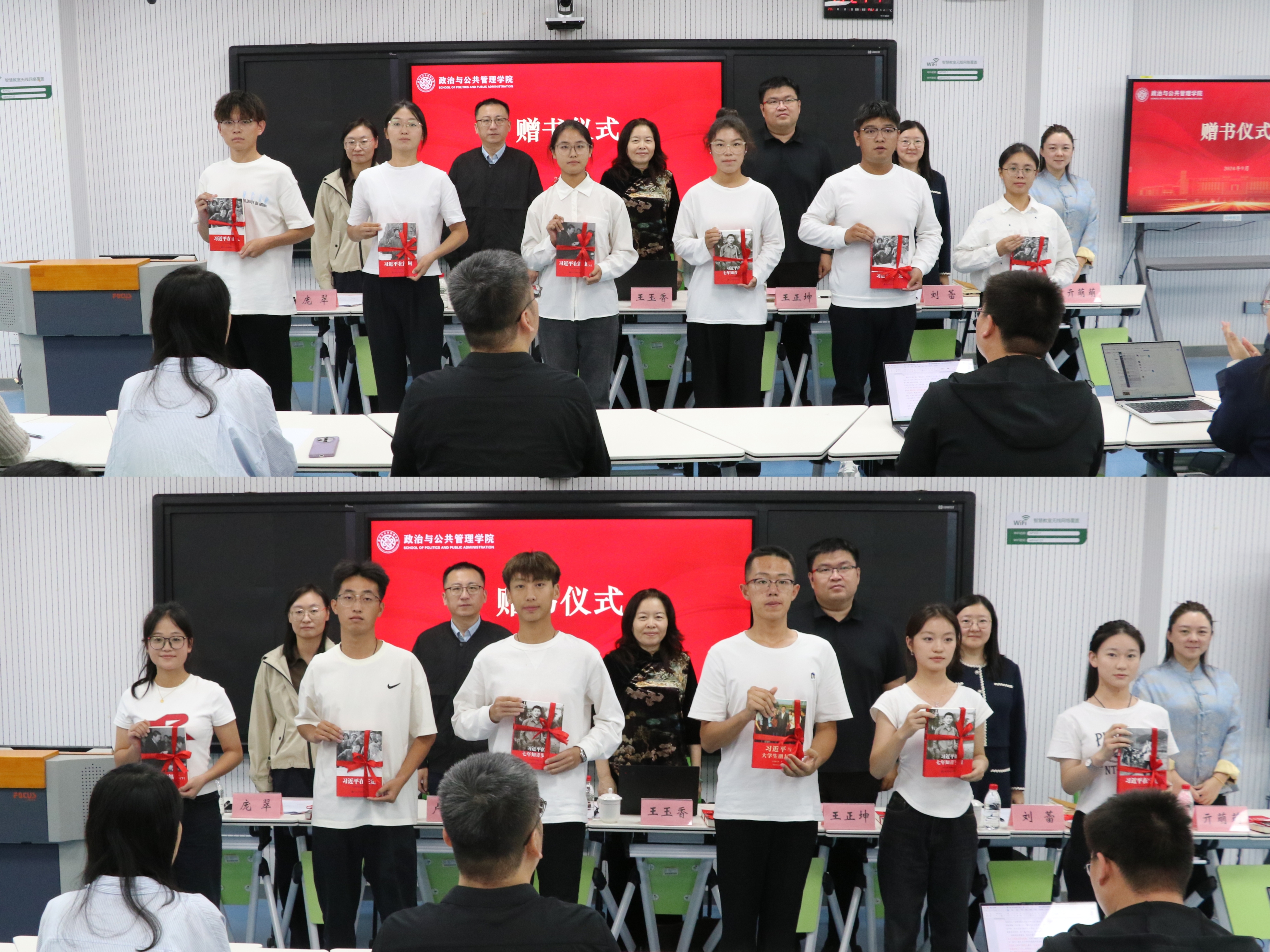 会上,学院领导老师为军训标兵赠送书籍并合影留念。