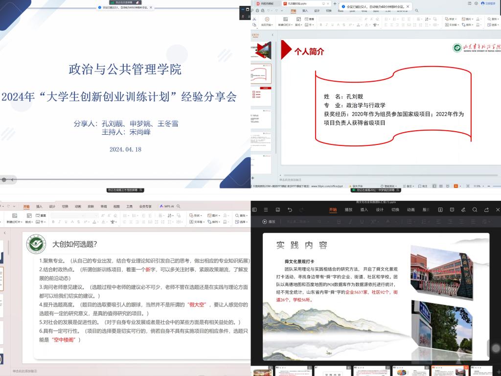 经验分享,明确方向。学院邀请2023年大学生创新创业训练计划项目主持人孔刘靓、申梦姚、王冬雪三位同学围绕项目选题、团队组建、实地调研等内容开展申报经验分享。同学们在交流环节中围绕大创项目申报的流程和准备事项进行了提问和互动,主持人认真回答,激发了同学们对科技创新工作的兴趣,明确了努力方向。