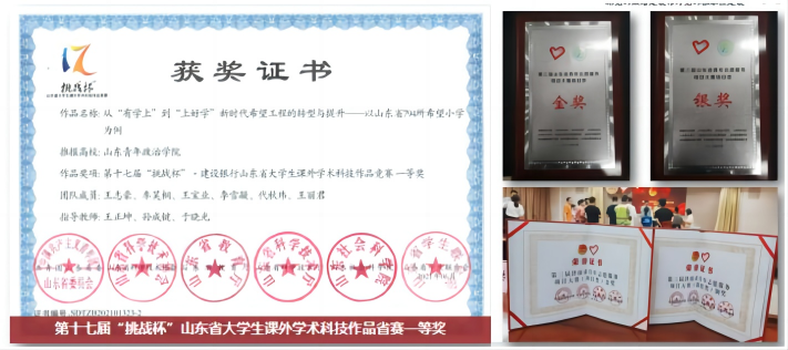 专业师生受邀在服务黄河国家战略,助力黄河流域生态保护和高质量发展青年志愿服务交流会上作专家发言,在全国社区志愿服务示范项目团队交流会上分享交流经验。荣获全国大学生模拟政协提案大赛一等奖1项、三等奖1项、优秀提案奖1项。全国大学生创业综合模拟大赛一等奖1项,全国创新创业管理决策模拟决策大赛一等奖1项,全国志愿服务项目大赛银奖1项、铜奖1项,挑战杯山东省大学生课外学术科技作品大赛一等奖2项等。2023年5月,学院法律事务专业学生代表队荣获第三届“亚伟杯”信息处理大赛高校组团体二等奖,并入围第54届国际信息处理大赛。