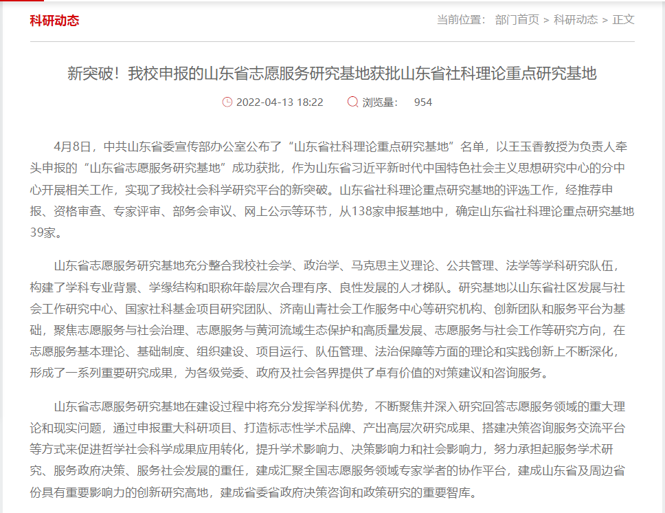 图7:2022年4月,获批山东省社科理论重点研究基地