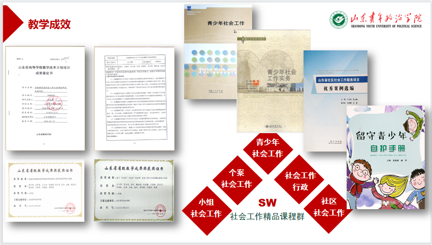 教学改革成果凸显。2017年,社会工作专业教师团队获评首批山东省高校黄大年式教学团队;2018年,“基于‘大社区’平台‘实务型’社会工作专业人才培养模式的实践与探索”获第八届山东省普通本科高校教学成果一等奖,“复合知识竞争视阈下的新建本科院校核心竞争力培育研究与实践”获二等奖。2人获省级本科高校教师微课教学比赛二等奖,1人获省级青年教师教学竞赛三等奖。获省级教学改革重点项目2项,省级教改课题面上项目2项,一般项目2项。主编或者参编教材、教辅、专著48部。