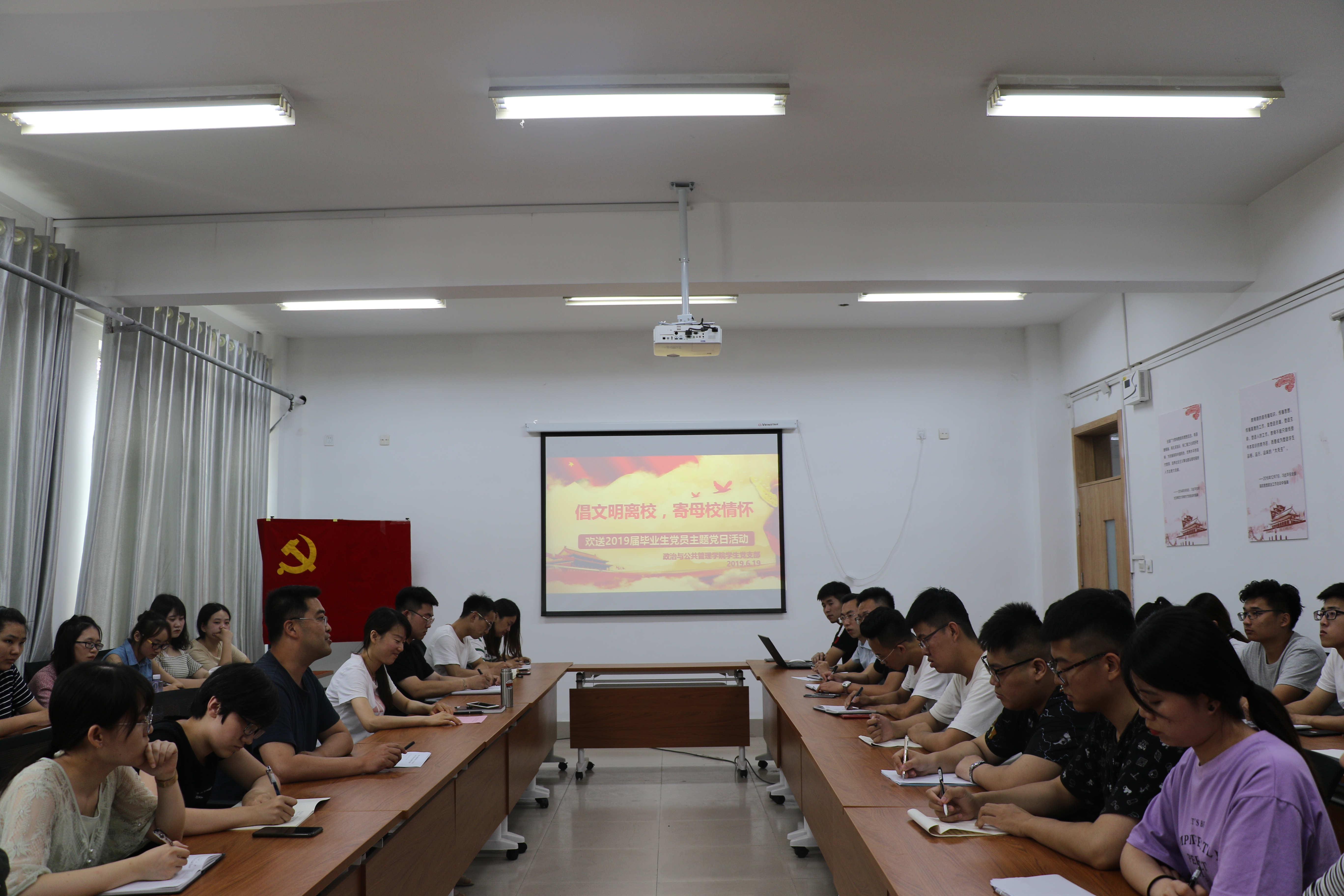 为进一步加强毕业生党员教育,提高毕业生党员的党性修养和责任意识,6月19日下午,政管学院学生第一、第二党支部组织开展了以“倡文明离校,寄母校情怀”为主题的毕业生党员毕业前的最后一次主题党日活动。yl8858永利集团学生第一党支部书记乔海波、学生第二党支部书记于瑶以及政管学院全体学生党员参加活动。活动分为党员座谈、展望分享、重温宣誓、毕业留念等四个环节。