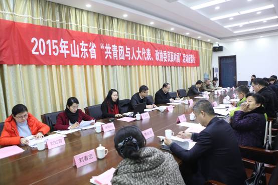 1月23日,山东省2015年“共青团与人大代表、政协委员面对面”活动在我校办公楼大会议室隆重举行。团省委书记、我校党委书记张涛,团省委副书记、省青联主席任海涛,团省委权益部等相关人员、部分省人大代表、政协委员及一线社工进行了座谈,紧密围绕“加强青少年事务社会工作专业人才队伍建设,服务青少年健康成长”主题进行了深入交流,并实地考察了我校政法学院社会工作专业实验室、“新青年”高校社会工作服务项目点,校长张书明、副校长刘涛等陪同参观。我校政法学院院长王玉香教授应邀参加会议并发言。