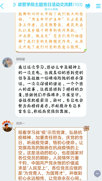 在随后各支部“学习榜样事迹、感受榜样力量”的讨论中,师生党员通过各种形式讨论交流。教工第一党支部的教工党员在观看节目后,撰写了心得体会。第二党支部通过腾讯会议云端交流学习感悟。教工党员韩芳丽在心得体会中写道:“虽然不是奋斗在防控疫情一线,但是同样是一种战场,同样是一场战斗,同样是一种奉献,同白衣天使相比,只是我们的工作场所不同而已。我们奉献,我们付出,我们收获,我们进步,这就是生活,这就是工作,这就是人生,这就是疫情常态防控之下我们的战场!”教工党员亓萌萌在交流会中说道:“6月28日,我成为一名光荣的共产党员,成为9191.4万成员中的一份子。今天在节目中看到一线抗疫榜样们给我们讲述的不平凡故事,令我非常动容,‘讲政治、有信念’是共产党员党性的核心要素,这种核心要素体现在平凡岗位中的爱岗敬业、无私奉献,体现在紧急时刻的奋不顾身,舍己为人,当看到几十面党旗在火神山医院飘扬,我的内心非常激动,同时也下定决心,绝不辜负自己共产党员身份,要将自己的事业根植于为人民服务教育事业中,坚守共产党人的初心和使命。”
