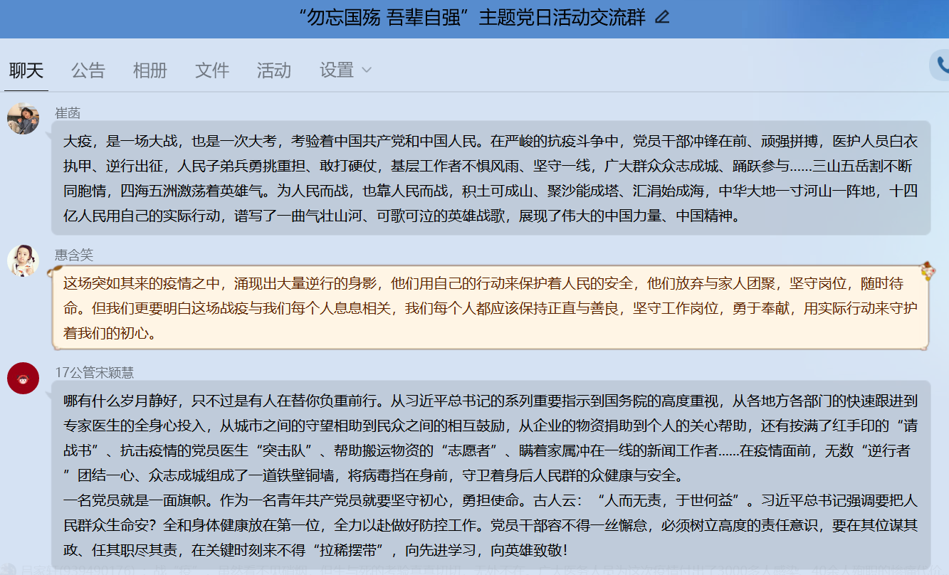 活动后学生党员纷纷在线分享了自己的感悟,学生党员房子琪分享了自己的心得体会,“英雄的中国,值得每一位中国人自豪与骄傲,我们庆幸生在中国。在这场没有硝烟的战争里,我们看到的更多是家国情怀。嘹望未来,传承责任,青年人继承心有大我,肩有大任,行有大德的时代精神。作为当代大学生,要勇于担当时代赋予的使命和责任,牢记爱国是最大的责任担当,为中华之崛起而读书,为中华民族的伟大复兴而奋斗终生!”