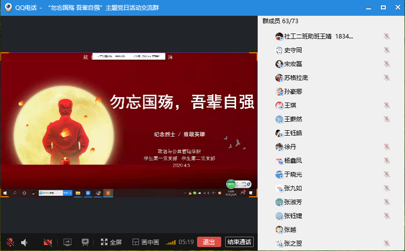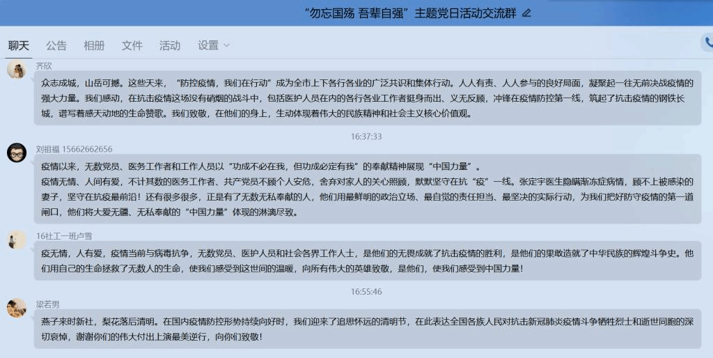 4月4日,农历庚子年清明节的清晨,为表达全国各族人民对抗击新冠肺炎斗争牺牲烈士和逝世同胞的深切哀悼,社会各界举行全国性哀悼活动,yl8858永利集团学生党支部也通过“学习强国”QQ群网络平台,在线开展了“勿忘国殇,吾辈自强”主题党日“云”活动。本次活动由学生第二党支部书记庞翠主持,共分为三个主题,一是集体悼念抗疫英雄,缅怀逝世同胞;二是青年党员集体学习抗疫英雄事迹;三是讲述身边平凡英雄事迹,分享心得感悟。