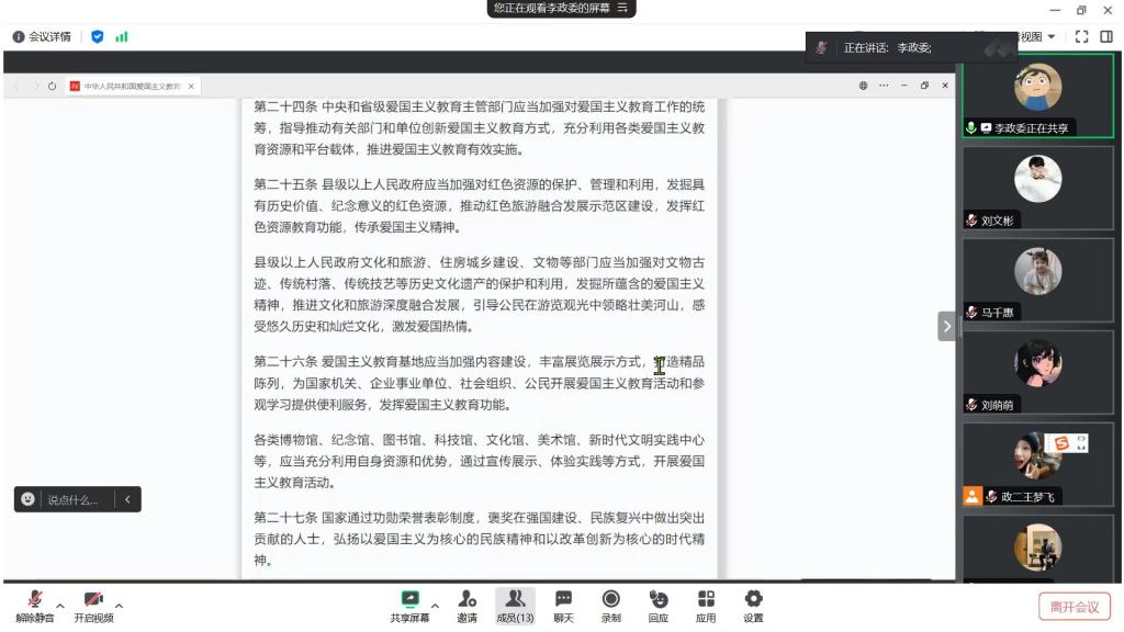 《中华人民共和国爱国主义教育法》中规定了爱国主义教育的主要内容,涵盖思想政治、历史文化、国家统一和民族团结、英烈和模范人物事迹等方面,是对丰富的爱国主义教育内容的具体阐释。爱国主义教育是思想政治教育的重要内容,具有独特的重要意义。参会党员一致认为,通过学习,能够更加牢固树立当代青年对国家的认同感、归属感、荣誉感,在思想上提供引领,增强青年学生的文化自信和情感共鸣,促进国家和社会的发展。