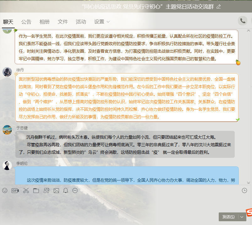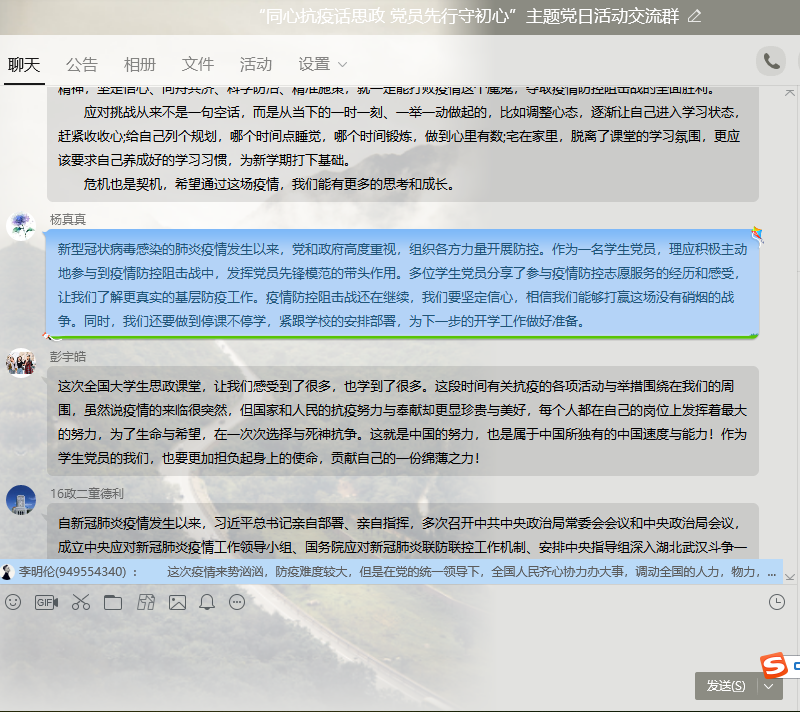 课后学生党员在线分享了自己的微党课学习心得,学生党员张智伟分享了自己心得,“大事难事见担当,危难时刻显本色。作为学生党员,我们是阻击疫情、履行责任的重要力量,我们将服从安排,勇于担当,为阻击疫情贡献自己的力量。”