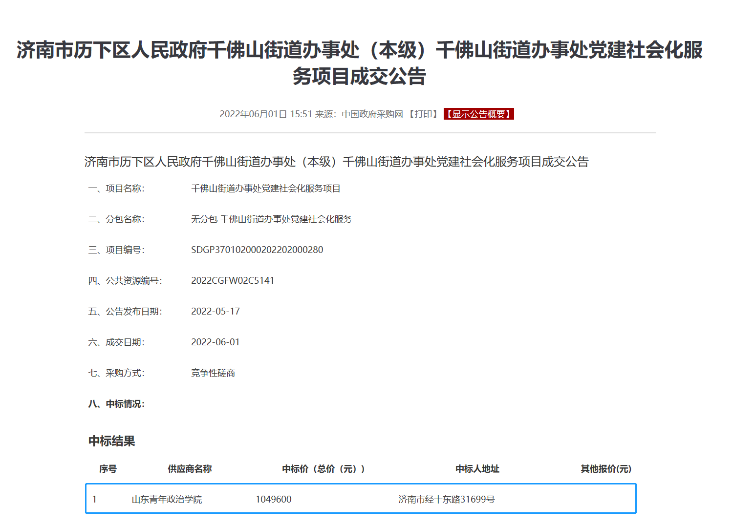 近日,我校通过政府公开采购的方式成功中标济南市历下区人民政府千佛山街道办事处党建社会化服务项目,该项目服务区域覆盖千佛山街道办事处及其下辖7个社区,项目成交总金额为104.96万元。