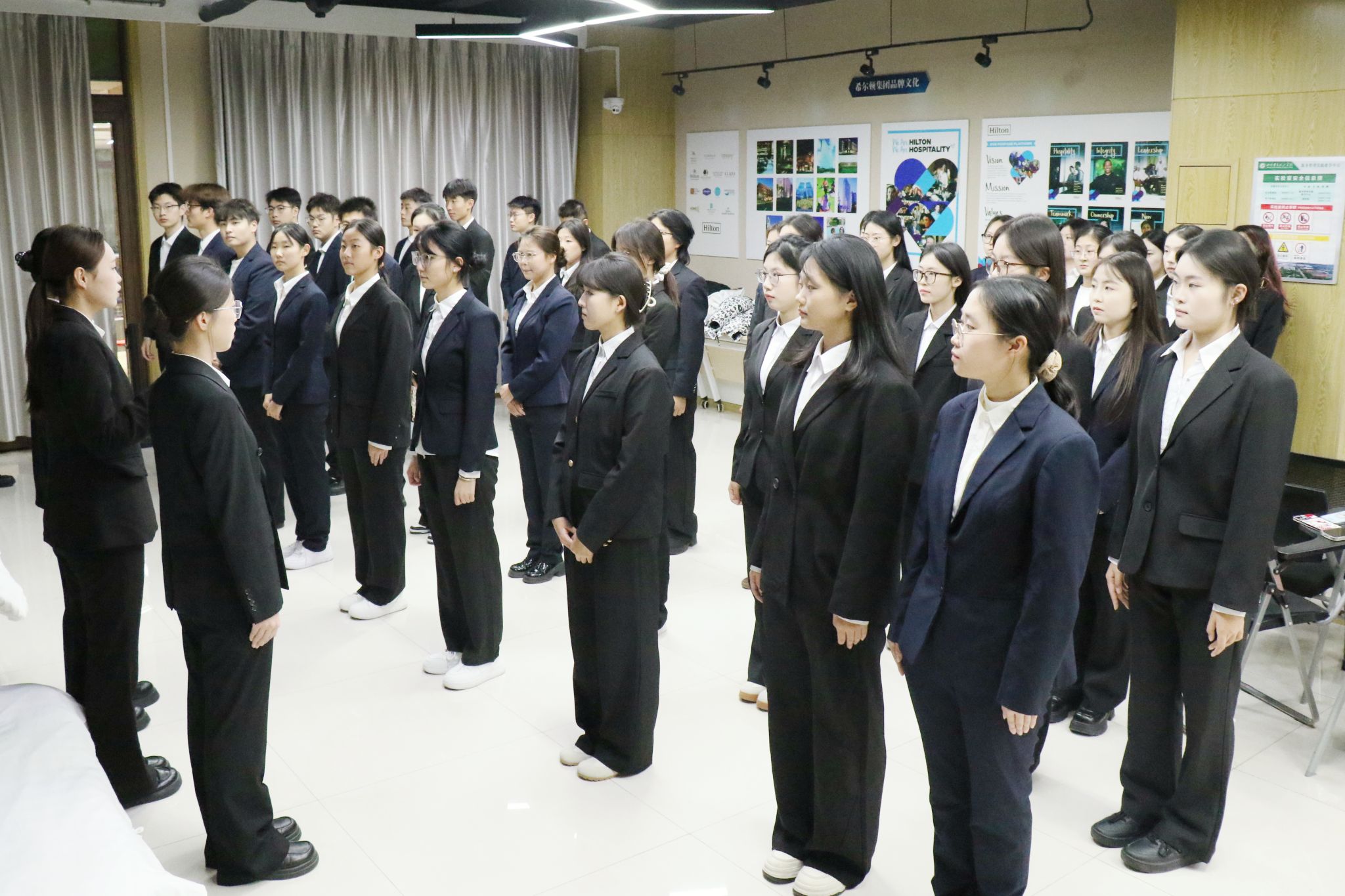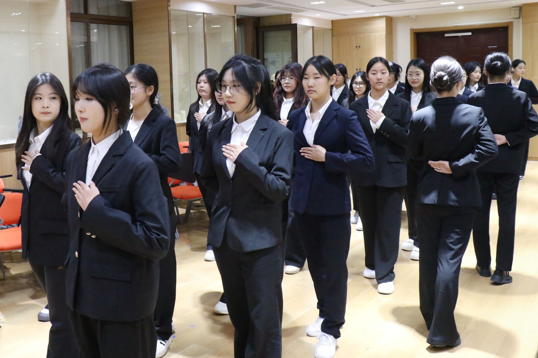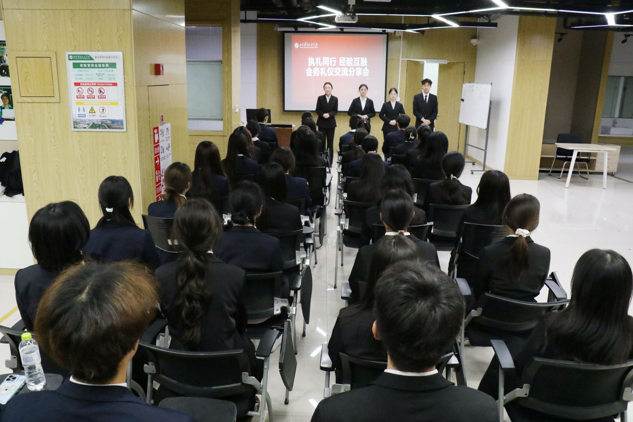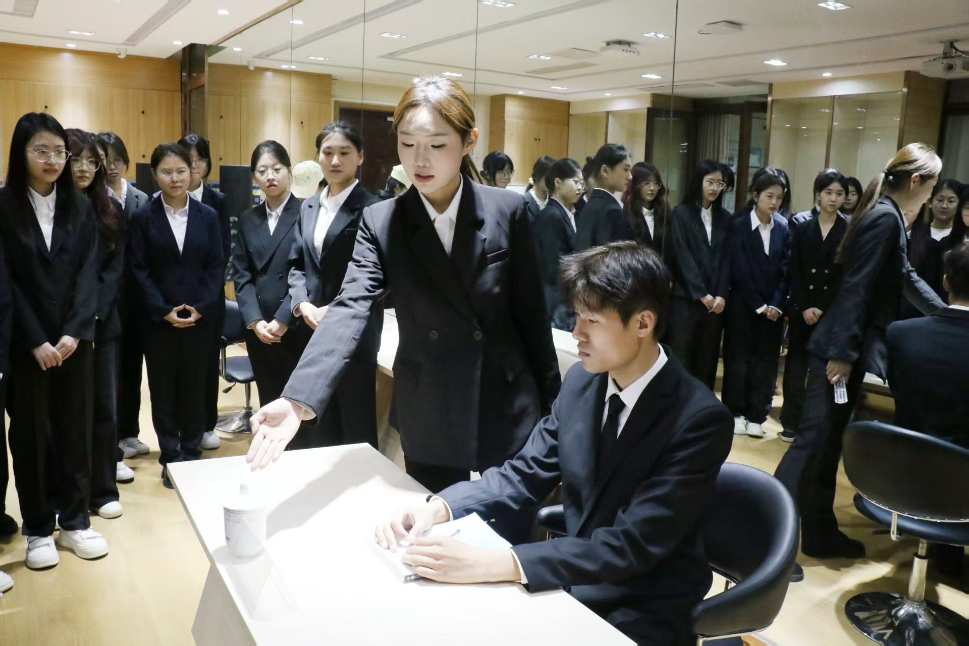 本次培训共分为“理论讲解”与“实战演练”两个部分。赵津秀以提升校园会务服务能力为核心,从仪容仪表规范、会务接待实操及应急场景应对等方面,系统讲解校园会务礼仪核心知识与工作要点,为学员们奠定了坚实的理论基础。实战演练环节涵盖体态礼仪与实操技能两大模块:体态规范方面,通过“讲解、示范、纠错”的互动模式,让同学们熟练掌握站姿、蹲姿、坐姿等标准体态要求;实操技能方面,重点演练了嘉宾接待、会务引导等关键环节,明确操作流程与礼仪细节,同时结合具体案例对席签摆放、茶水添续等基础会务事项的规范要求进行了细致教学。培训过程中,同学们积极参与实操演练,在主讲人与指导团队的悉心指导下,逐步掌握各类会务礼仪技能,真正实现专业礼仪知识与校园服务实践的深度融合。培训结束后,同学们就在会务工作中需坚守的“细致入微、热情得体、高效协作”的服务准则达成高度共鸣,纷纷表示将把所学技能运用到后续校园会务服务中。