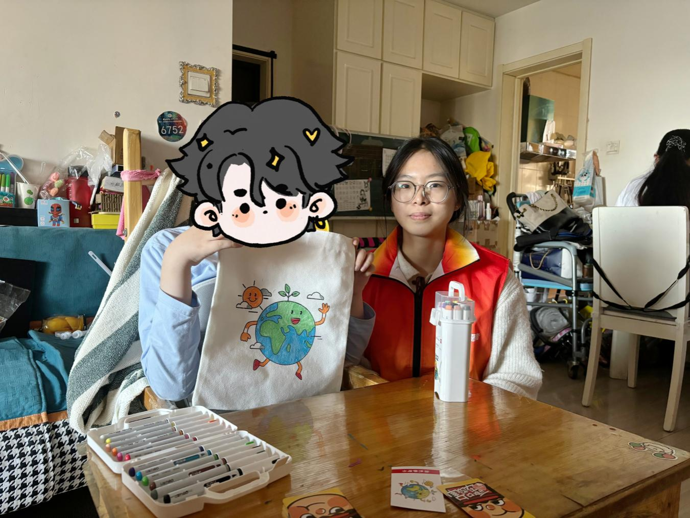 活动以“识大雪”节气互动温情开场,志愿者通过简单的提问,引导小希分享对感恩与环保的理解,建立起初步的认知连接。在随后的帆布袋创作环节中,在志愿者的引导下,小希围绕“保护树木小卫士”“开花的地球”等主题进行自由描绘与创作,并将作品作为感恩礼物送给父母,深切地表达了内心的情感。