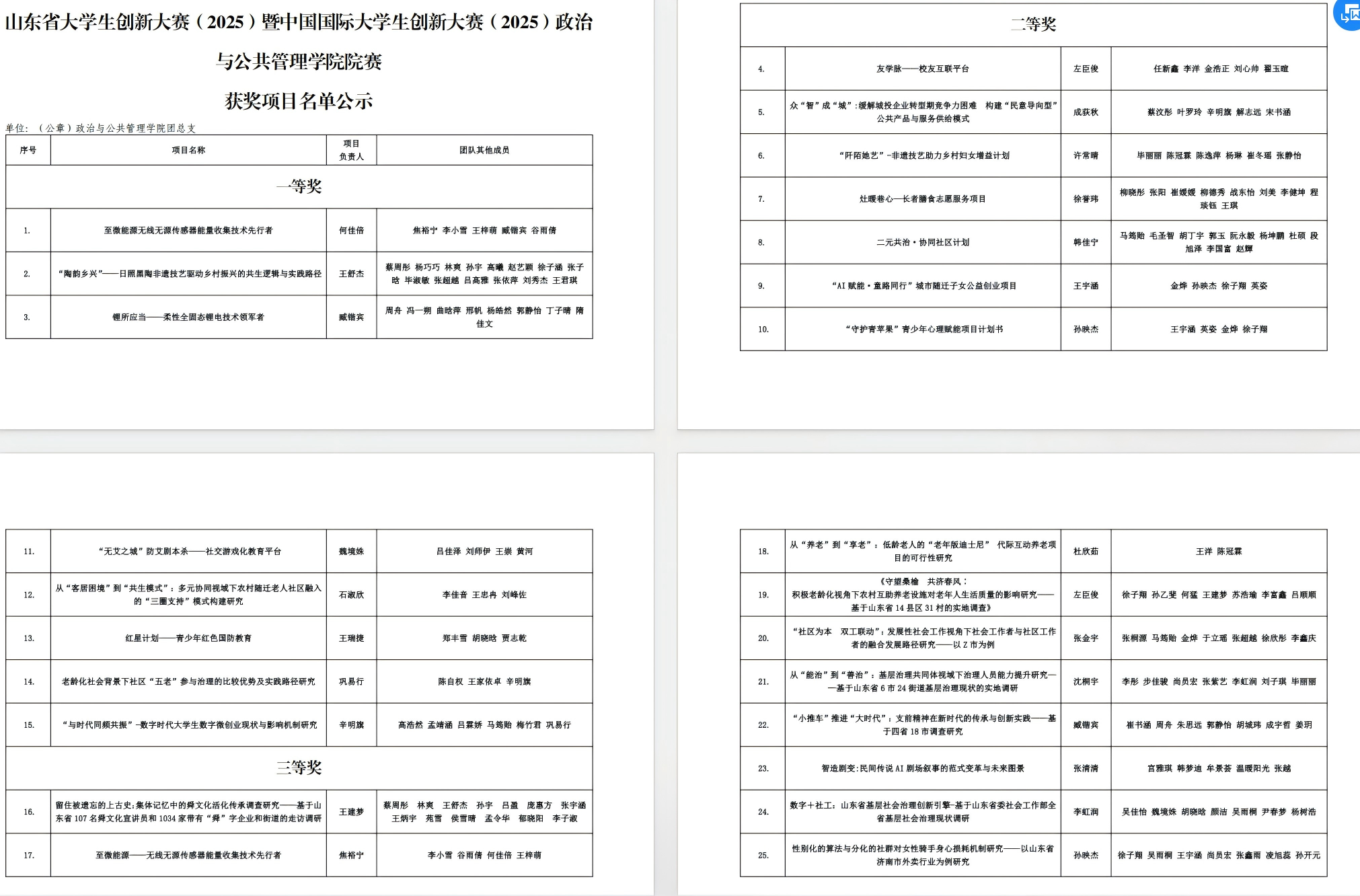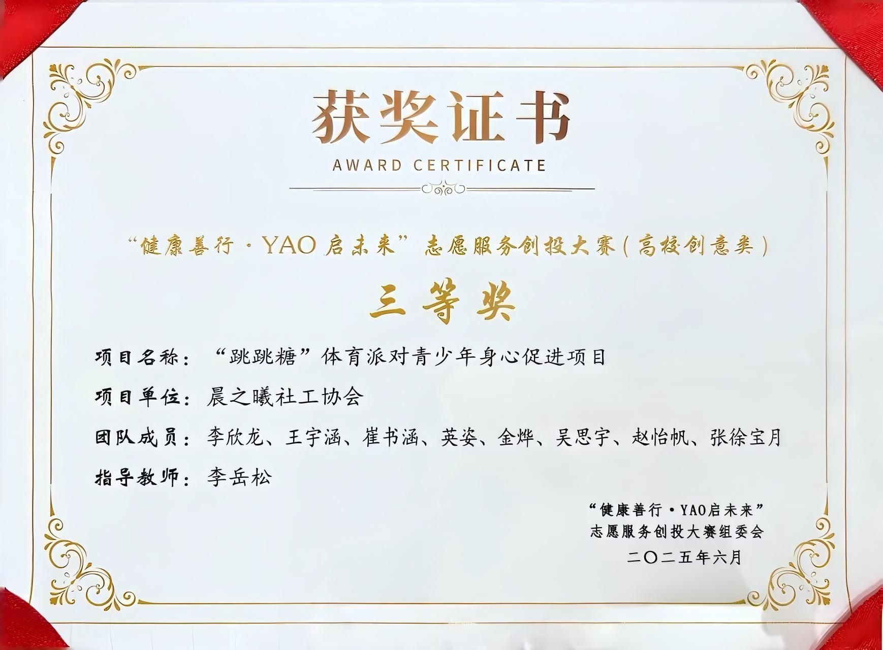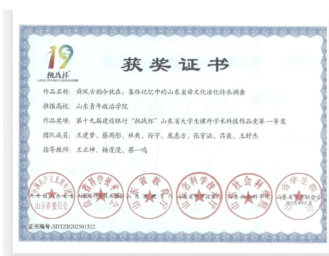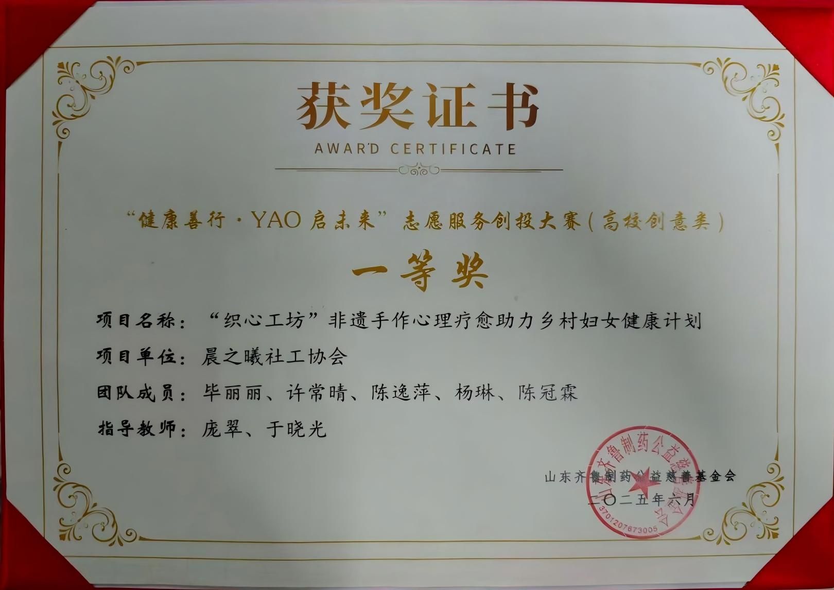 在市级及以上赛事中,学院项目屡创佳绩:“灶暖巷心”——长者膳食志愿服务项目荣获第三届山东省青年志愿服务公益创业赛金奖;舜风古韵今犹在:集体记忆中的山东省舜文化活化传承调查项目在第十九届建设银行“挑战杯”山东省大学生课外学术科技作品竞赛中斩获一等奖,在2025年大学生新文科创新实践大赛中荣获银奖;“织心工坊”非遗手作心理疗愈助力乡村妇女健康计划项目在“健康善行·YAO启未来”志愿服务创投大赛中获高校创意类一等奖,并在第七届济南市青年志愿服务项目大赛中再获银奖,同赛的“跃动青春,心向阳光”青少年心理赋能项目获铜奖;“跳跳糖”体育派对青少年身心促进项目也在“健康善行·YAO启未来”志愿服务创投大赛中荣获高校创意类三等奖。