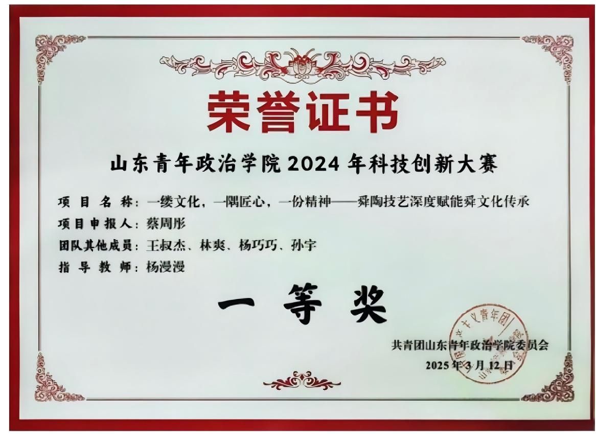 在校院两级的赛事中,项目培育亦结出硕果:“陶韵乡兴”——日照黑陶非遗技艺驱动乡村振兴的共生逻辑与实践路径项目在山东省大学生创新大赛中荣获校级金奖。在山东省大学生创新大赛中,“AI赋能·童路同行”城市随迁子女公益创业项目、“守护青苹果”青少年心理赋能项目与“阡陌他艺”非遗技艺助力乡村妇女增益计划,共同荣获院级二等奖。