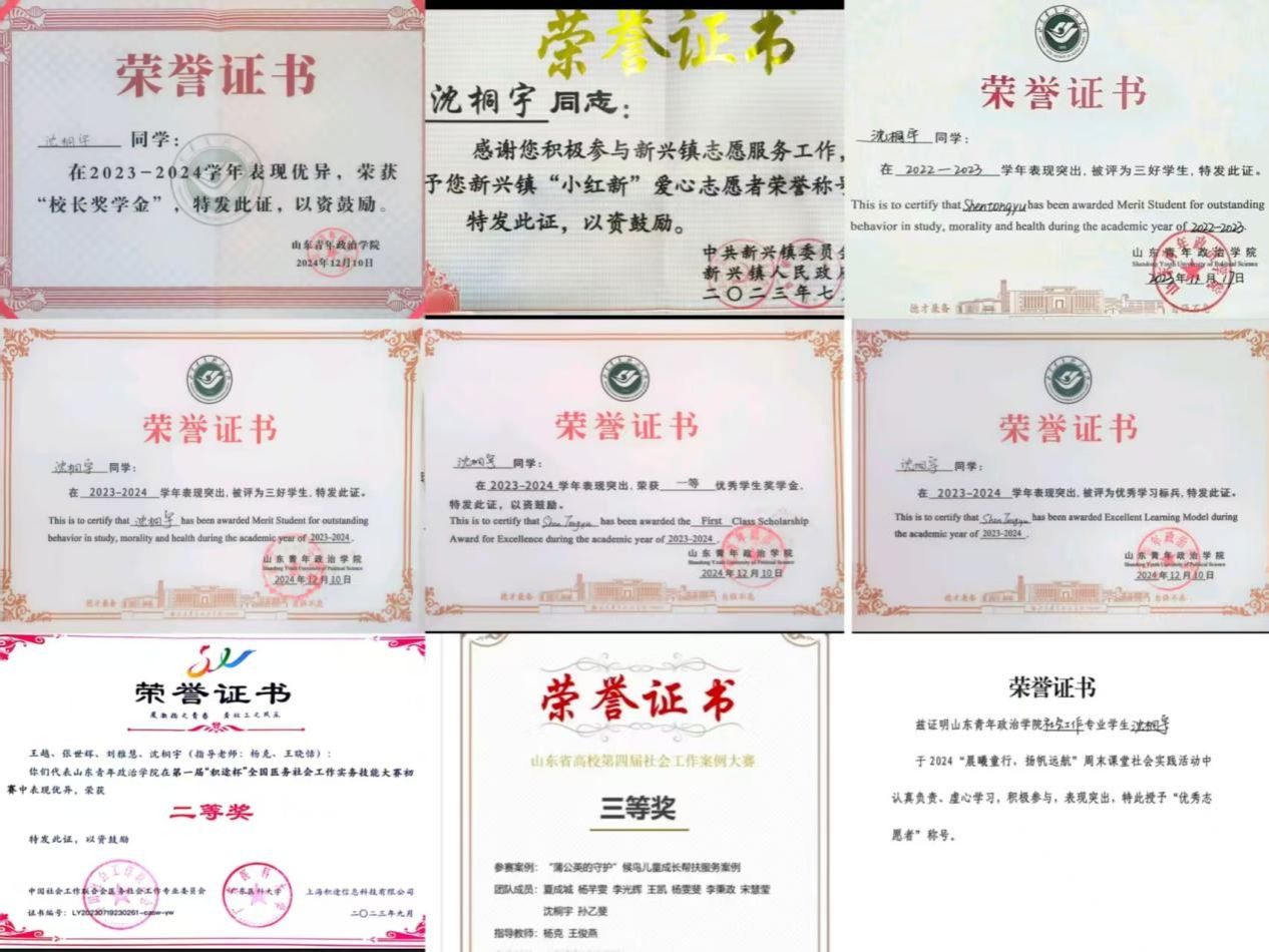 自入学以来,沈桐宇始终坚持深耕专业、笃行不怠。在科研方面,作为项目负责人,她成功推动2项省级志愿服务项目落地见效,其主导的“一路‘童’行”项目两度荣获省赛奖项,实践成果获基层单位致信表彰。在实践调研方面,她始终以实践为课堂,先后参与国家社科基金项目实地调研、山东省经济社会综合调查等重要工作,足迹遍布城乡各地。在学术竞赛中,她凭借扎实的专业积累在“挑战杯”“积途杯”等比赛中屡获佳绩,从校级一等奖到全国二等奖,每一步都印证着她的执着与勤勉。不弃微末,久久为功,她始终以真诚热忱的脚步,踏实丈量着当代青年的责任与担当。