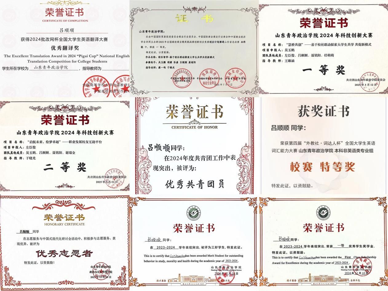 学习上,吕顺顺在专业领域持续深耕,学分绩点与综合测评成绩稳居专业前列。科研上,她秉持“以赛促学、以研促思”的理念,在科研与竞赛中双向发力,先后参与教育部产学合作协同育人项目、省级大学生创新创业计划等多项课题,同时积极投身全国高校商业精英挑战赛、“批改网杯”英语翻译大赛等赛事,荣获国家级、省级重要奖项。社会实践方面,她主动投身山东省社会经济综合调查、乡村振兴志愿服务等项目,深入基层一线,在实践中拓宽视野、增长才干,以青春行动践行成长初心。