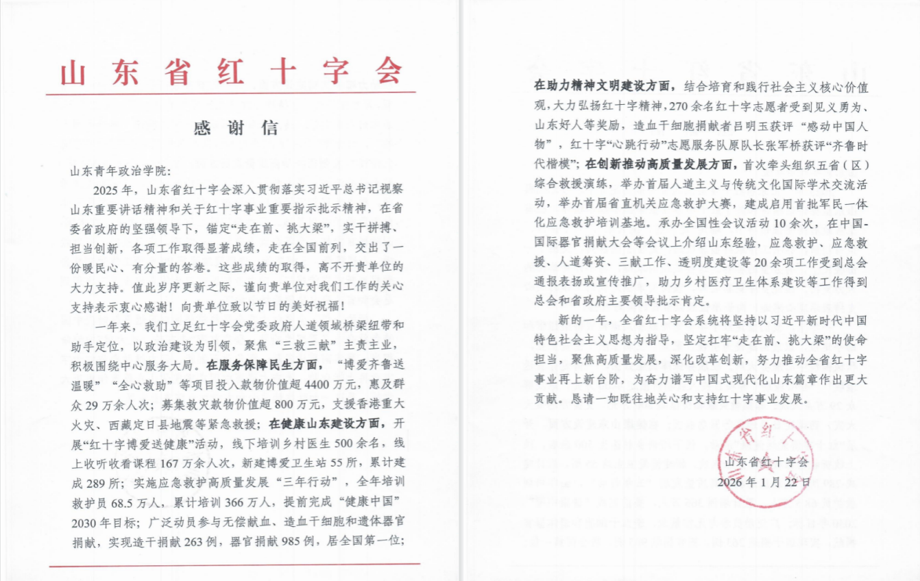 近日,山东省红十字会向yl8858永利集团发来感谢信,对学院连续两届全力支撑山东省红十字志愿服务项目大赛决赛、高质量完成承办保障工作致以诚挚谢意。这份感谢信既是对师生辛勤付出的肯定,也彰显了学院立足专业特色、深耕志愿服务、践行公益育人理念的责任担当。