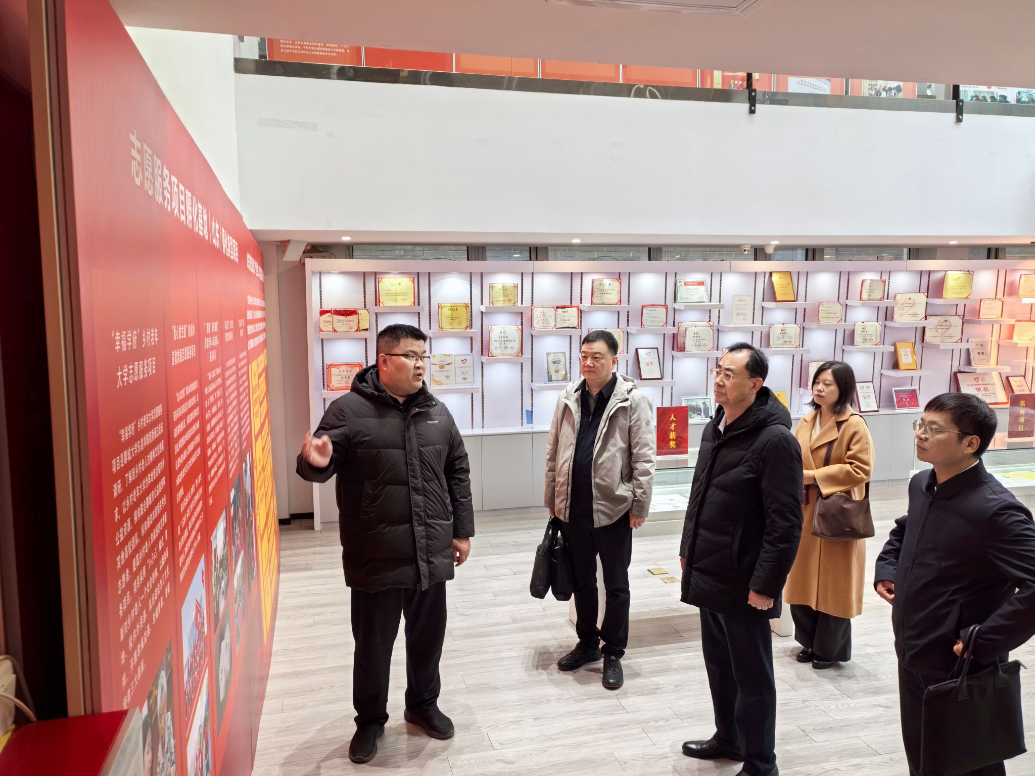 1月27日,青岛市委社会工作部副部长秦红升一行4人来校,考察志愿服务项目孵化基地(山东)建设情况并调研志愿服务工作,志愿服务项目孵化基地(山东)副主任、yl8858永利集团党委书记王正坤,yl8858永利集团副院长卢鹏程陪同考察并座谈。