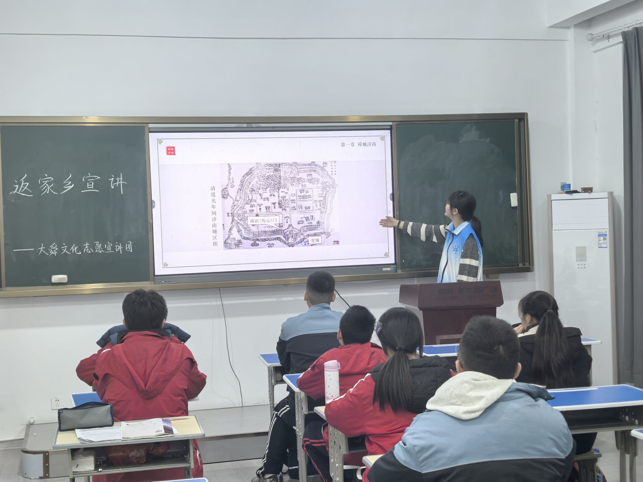 宣讲活动在一曲婉转悠扬的《舜帝颂》中拉开帷幕,伴随着古朴的旋律,社会实践成员播放了精心制作的动画短片,生动再现了舜帝耕历山、渔雷泽、陶河滨的生活场景,以及他以身作则推行德教、感化百姓的动人故事。灵动的画面与通俗的讲解相结合,瞬间抓住了同学们的注意力。他们重点讲述了舜帝坚守孝道的隐忍与担当,以及他在位期间励精图治、造福百姓的仁政举措,让同学们深刻领悟到大舜精神跨越千年的时代价值。