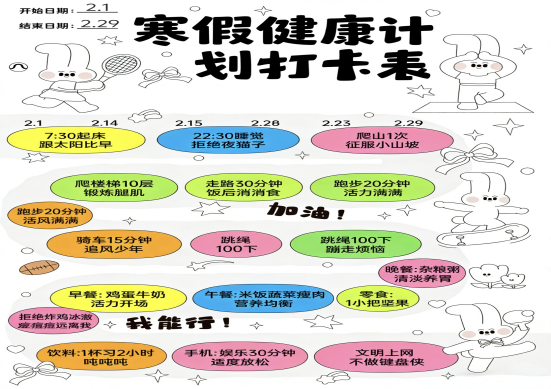 本次活动倡导全体学生结合自身实际,量身定制专属寒假健康计划,计划全面覆盖作息规律、体育锻炼、膳食营养、科学用眼、文明上网五大核心维度。一份份详实的时间规划表,是学子们告别熬夜贪睡、践行健康生活的郑重承诺;一次次居家或户外的运动打卡,彰显着青年学子坚持锻炼、昂扬向上的青春活力;一餐餐精心搭配的营养膳食,是学子们对自身健康负责的具体实践。同学们以计划为行动指引,将健康生活的理念融入日常,转化为每日可执行、可落实的具体行动,让健康生活有章可循、有据可依。