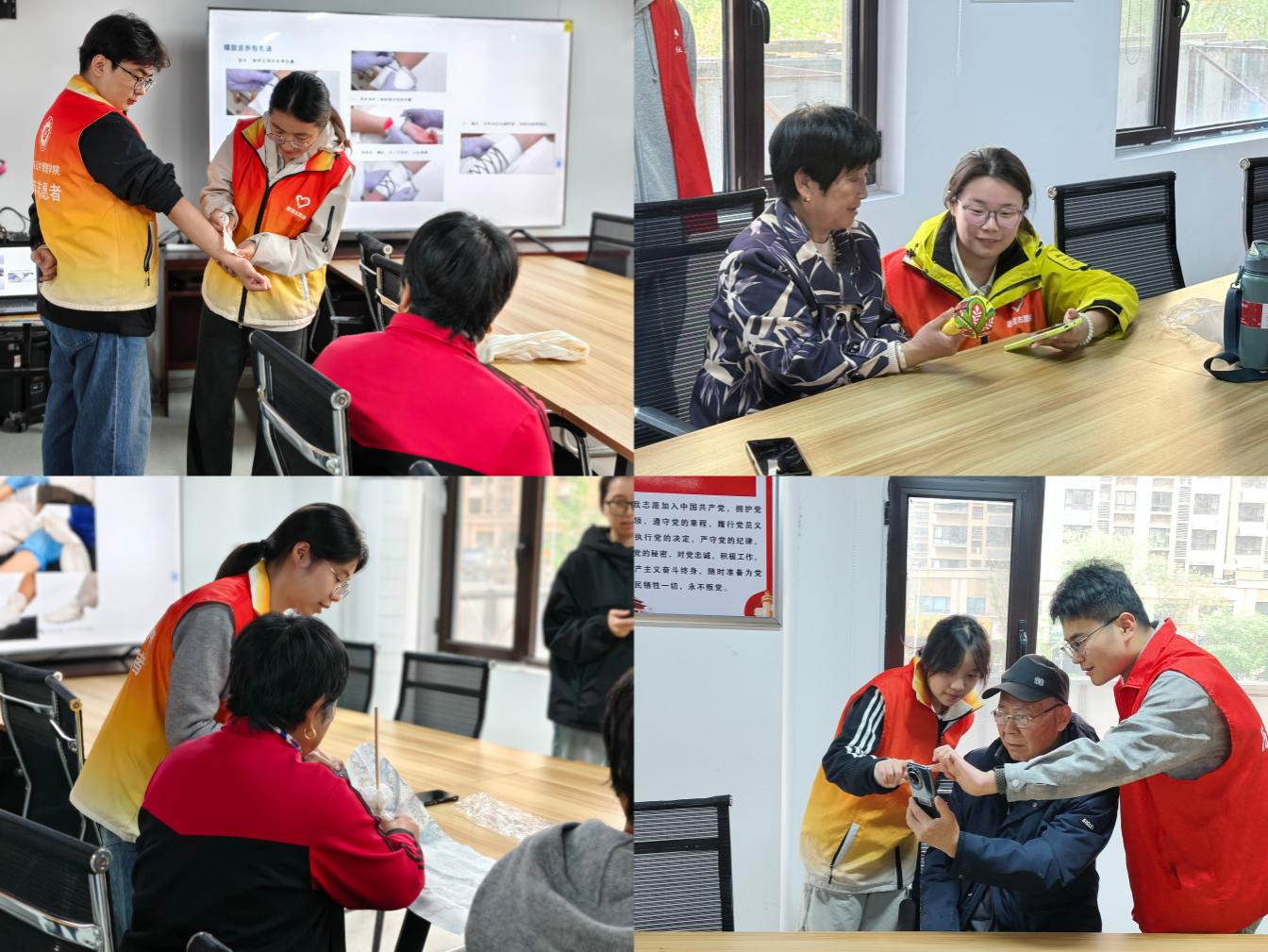 活动分五期有序开展,采用通俗讲解、投屏演示与一对一辅导等适老化形式,搭建起完善的数字教学体系。首期开设AI零基础课程,志愿者以短视频导入,讲解豆包AI基础操作与核心功能,依托现场互动,引导老人迈出使用AI第一步。第二期为反诈专场,以情景短剧拆解常见诈骗套路,并指导老人动手制作反诈平安香囊,增强防骗意识。第三期聚焦AI实用功能与情感纪念,教授日常操作技巧,组织AI修图、返老还童照片生成等体验活动。第四期聚焦健康养生与应急救护,现场教学清肺拍拍操,引导老人借助AI检索养生知识,并安排创伤包扎教学与艾草枕DIY活动。第五期以智慧出行为主题,介绍出行实用技能,设置问答互动环节。活动结尾设置景点与马年主题剪纸体验,帮助老人巩固学习成果。