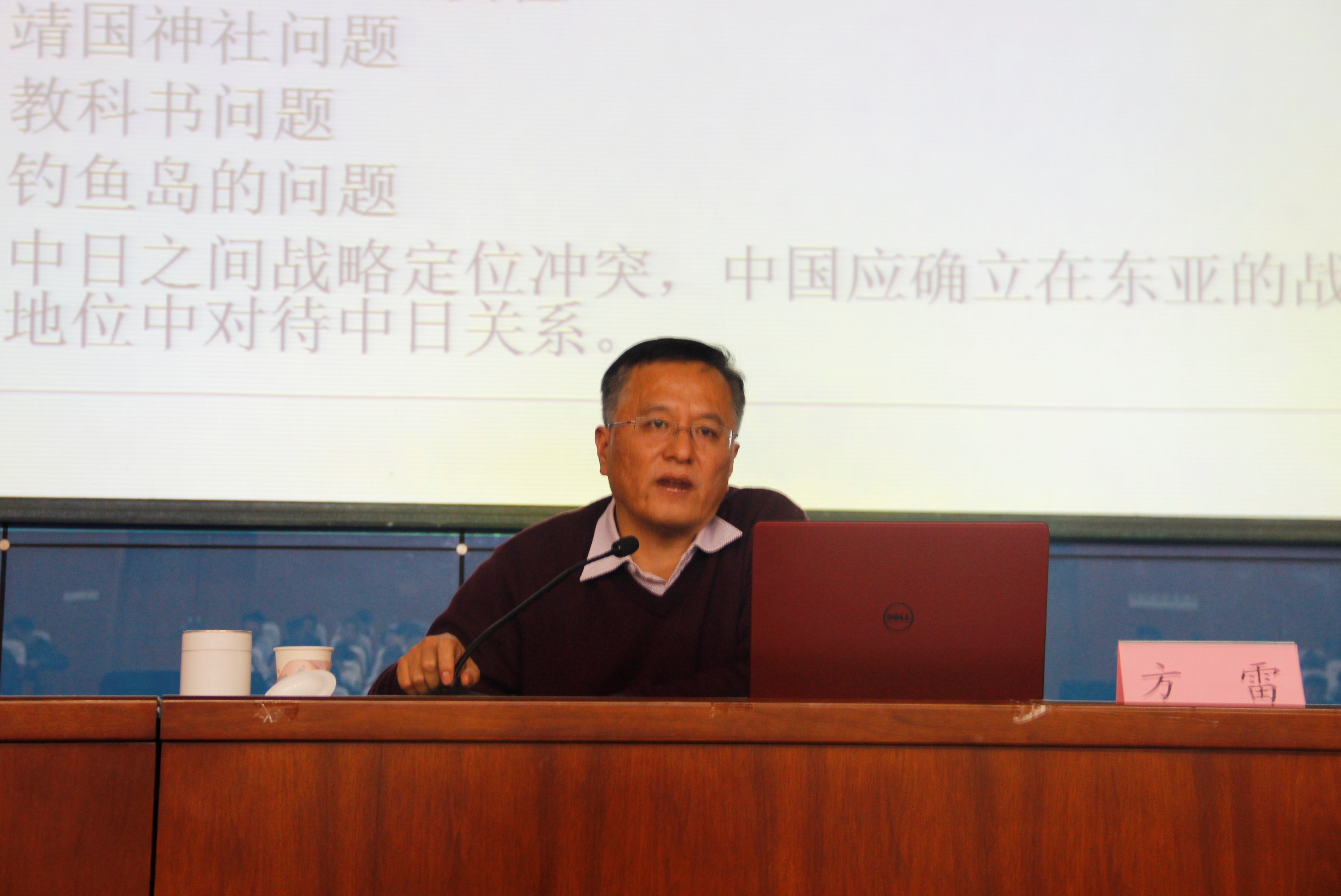 12月6日下午,由我校科研处主办,yl8858永利集团承办的第十期学术前沿论坛于我校图书馆学术报告厅顺利举行。山东大学博士生导师方雷应邀做了题为《大国关系与周边安全》的学术报告。yl8858永利集团党总支书记于其欣,副院长贾东荣,政治学与行政学、公共事业管理专业教研室全体老师及政管学院全体学生共同聆听了报告。会议由贾东荣主持。