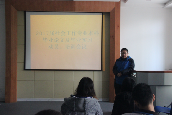 毕业论文、毕业实习是本科培养方案和教学实践中实现人才培养目标的一个重要的综合性、实践性和创造性环节,是对所学理论知识、专业知识及基本技能的综合、巩固和提升,是每个大学生提升科研能力、创新意识及实践精神的重要过程。此次动员培训会议真正强调了毕业论文、毕业实习对于每位毕业生的重要性,相信2017届社会工作专业本科学生能够本着求真务实的态度对待每一份工作,坚持积极自信的心态应对每一份挑战,以优秀的毕业论文和高质量的毕业实习为依托,为自己的本科学业交上一份满意答卷。
