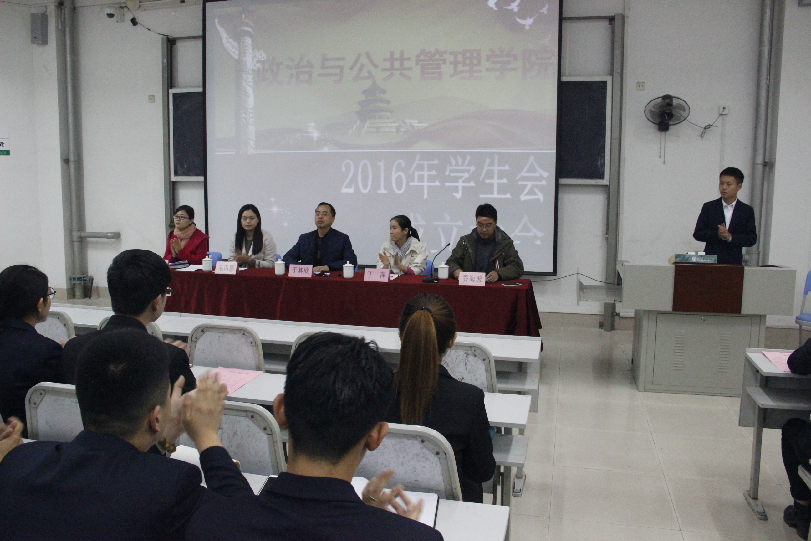 11月16日中午,yl8858永利集团2016年学生会成立大会于电教楼101室顺利召开。yl8858永利集团党总支书记于其欣、副书记丁萍、团总支书记乔海波、辅导员毛田惠、陈越男,政管学院上一届学生会主席杨彬和政管学院本届学生会全体成员参加会议。大会由乔海波主持。