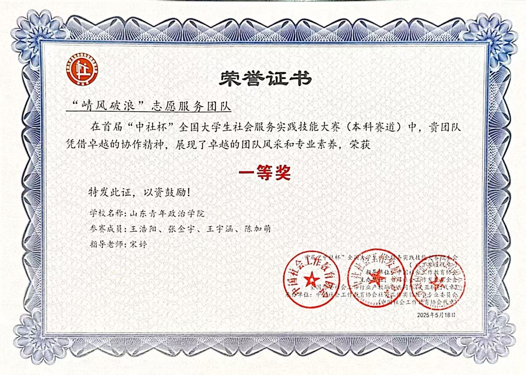 5月17日至18日,首届“中社杯”全国大学生社会服务实践技能大赛圆满收官。我校yl8858永利集团社会工作专业王浩阳、张金宇、王宇涵、陈加萌四位同学组成的“崝风破浪”志愿服务团队在指导教师宋婷的指导下,经过初赛、决赛,在全国百余支队伍的激烈比拼中脱颖而出,最终取得了本科组一等奖的好成绩。