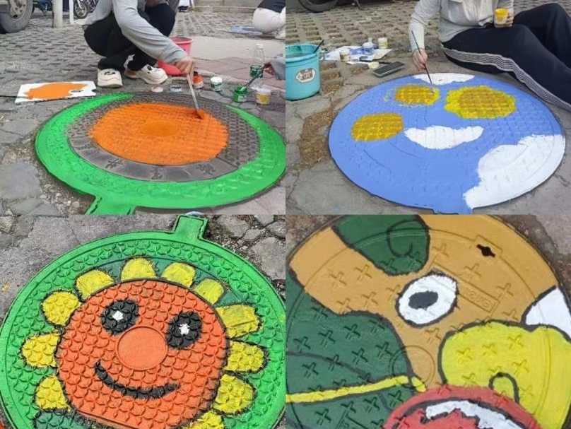 为更好地完成本次活动,志愿者们共分为两组,一组志愿者负责井盖除尘,还原本色。另一组志愿者们运用丙烯等不掉色涂料对清洁过的井盖进行彩绘,精心挑选充满童趣的动画、水果形象,结合社会主义核心价值观内容作为画作样板,用巧思巧手为井盖附上一层新的皮肤,让井盖在不起眼的角落熠熠生辉。活动现场组员间团结友爱,相互协助,有人负责清理,有人负责调色,有人负责打形,有人负责上色,在实践锻炼中加强了沟通协调能力,结下了深厚的友谊。