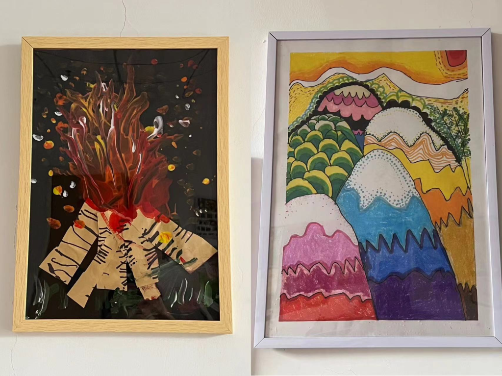 项目行进间,温馨瞬间频现。济南博乐果实班的乐乐(化名),昔日寡言少语,情绪易波动,常以怒吼为伴。在志愿者积极引导下,乐乐渐启心扉,以画笔为桥,表达情感。从烈焰熊熊到绚烂山峦,色彩与图案的转变中,情感的变动和成长的轨迹跃然纸上。