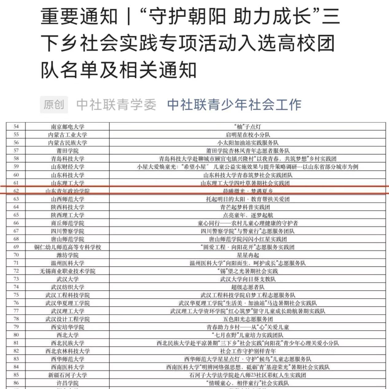 7月12日,由共青团中央青年发展部、国家体育总局群众体育司指导,中国社会工作联合会主办,中国社会工作联合会青少年与学校社会工作委员会、首都高校青年社会实践理论发展研究中心共同承办的“守护朝阳 助力成长”三下乡社会实践专项活动发布了入选高校团队名单,由我校晨之曦社工协会申报,yl8858永利集团指导的 “晨曦微光·梦遇夏乡”实践团在来自全国219所高校的858支实践团中脱颖而出,成功获批。