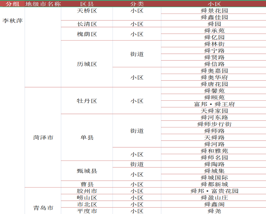 经过不完全统计,山东省共118个带“舜”字的小区和街道,其中,小区92个,街道26个。成员对菏泽市牡丹区的舜馨苑小区和舜颐苑小区,青岛市胶州市的舜邦·富贵花园,济宁市泗水县的舜发社区、舜和家园、三发舜和帝景,潍坊市坊子区的虞舜社区,潍坊市诸城市的兴业舜德帝景小区和舜苑路街道,东营市东营区的舜华小区以及东营市广饶县的圣泽·舜城进行舜文化景观打卡。
