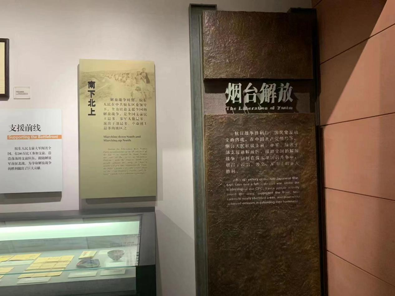 在烟台博物馆,队员们看到了烟台市博物馆重点展示的1921年——1949年中国共产党在胶东的诞生、发展和壮大,讲述了胶东革命史上的重大事件以及作为革命老区为山东乃至全国的解放所做的突出贡献。了解到了胶东军民在共产党的领导下,同日本侵略者、国民党反动派展开了殊死搏斗。革命战争年代,胶东地区先后有50万青年参军,280万人次民工支前,7.6万革命烈士为国捐躯,7250名干部南下北上,感受到了胶东为中国革命的胜利和新中国的诞生付出了巨大牺牲,做出了重大贡献。