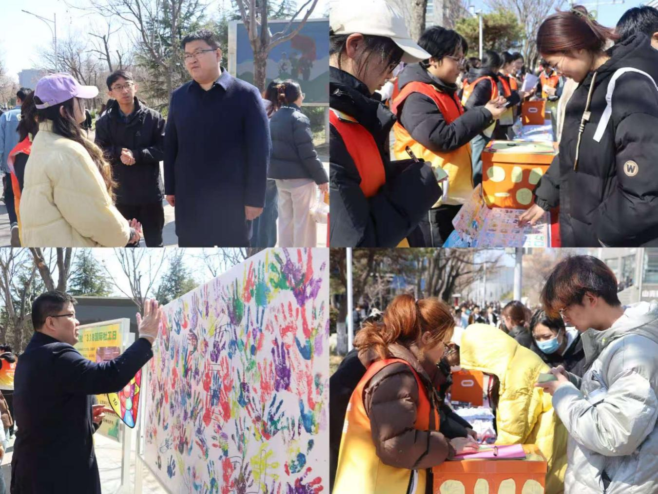 本次通过开展“时光信箱”“角色对对碰”“千人手掌墙”“粘粘球”等内容丰富、形式多样的活动,吸引了来往学生2000余人参与。在“时光信箱”活动中,参与者在便利贴上写下给过去或未来的自己的一封信,放入信箱后并抽取另一张他人的信,阅读并贴在展板上,形成“对话墙”,为同学们搭建了情感寄托和表达的桥梁,促进了同学之间之间的交流互动;在“千人手掌墙”活动中,同学们通过蘸取颜料,并沿着展板的“助人自助”上按下手印、写下祝福,五颜六色的手掌为活动增添了春日里的“多巴胺”,也生动地展现了社工对多元性的包容。现场气氛热烈,通过发动同学们参与各种不同的活动来提升大家对社会工作专业的认识,加强了对社工的认同感和知晓度。